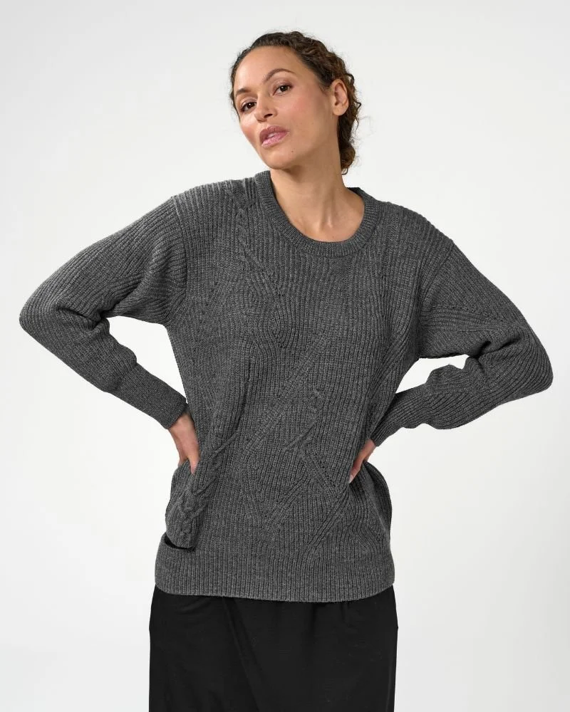 ARRA’s crewneck is their updated take on a fisherman sweater. The bottom rib slit is a unique departure from the overall relaxed fit, adding visual interest and enabling the wearer to showcase a garment underneath. Plus, their unexpected engineered rib and cable design moves around the body, following the flow of the luxurious, sustainable Italian merino yarn.