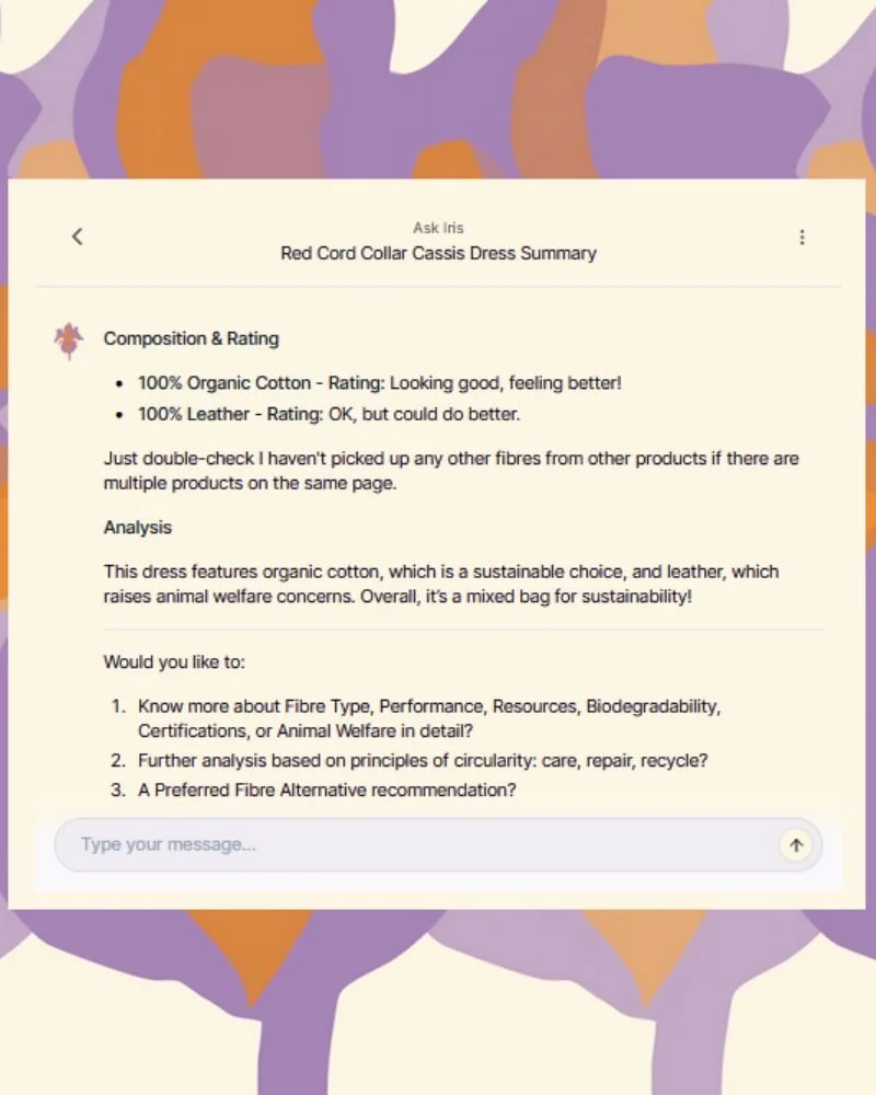 Conscious closet contribution: Iris is designed to empower you to make informed decisions about your fashion choices. When you sign up for the Iris web app, you’ll have access to a widget that sits on the side of your screen and activates a chat box. While you shop, Iris provides valuable insights into the materials and lifecycle of the items you’re browsing, so that you can make the most informed decision before heading to checkout.